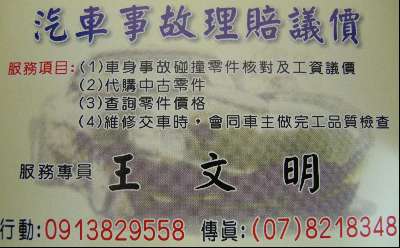 專長或服務內容: 您覺得.一般保養廠或公司服務廠的(車身碰撞與引擎維修)的價位合理嗎? 請由我的專業來為您服務與各大保養廠,公司服務廠核對維修零件與工資議價,節省您的荷包!對抗通膨與薪資零成長的時代...... 服務項目: (1)車身鈑金碰撞零件更換及工資議價 (2)車身底盤零件更換及工資議價. (3)引擎大修 (4)全車系車身烤漆 工資議價 (5)汽車零件新品代購 (6)中古零件代購 (7)維修估價單明細核對 以上七大項.維修交車時,會同車主做完工品質檢查.......若有不清楚的地方及車輛方面之問題,煩請來電~~~~~~~